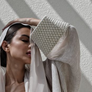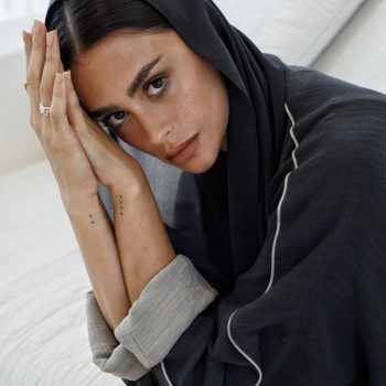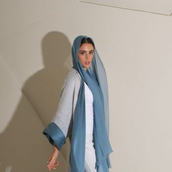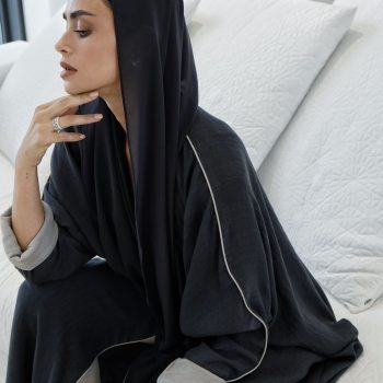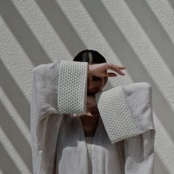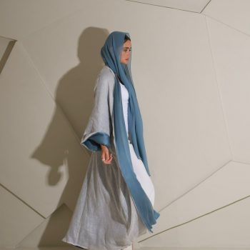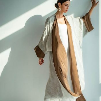 Wrinkled cotton silk abaya with embroidered dragonfly Biege